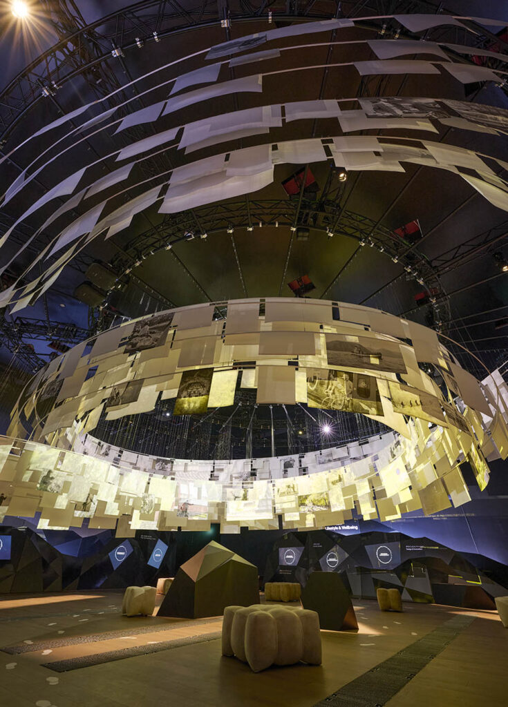 1階の展示ホールでは、ぐるりと360度を囲む大きなスクリーンが目に飛び込んできます。