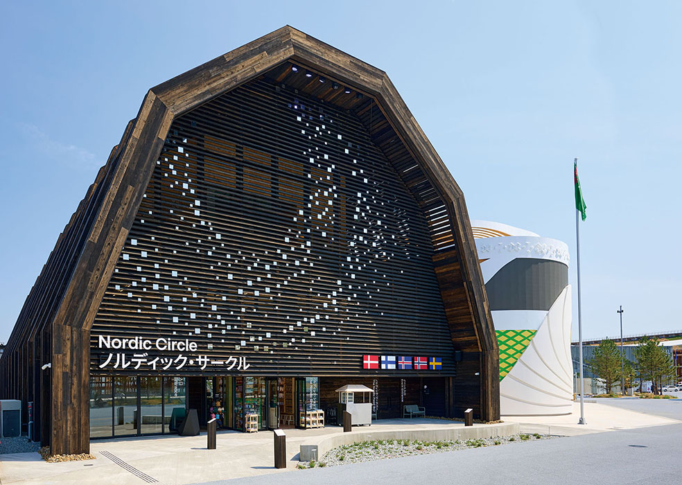 北欧パビリオン「ノルディック・サークル」は、北欧の伝統的な納屋を思わせる木造建築。再利用可能な木材をふんだんに使い、持続可能な建築としても注目されています。鉄やガラスの建物が多い会場の中で、あたたかみのある佇まいがひときわ目を引きます。壁面に浮かぶ渦のような模様には、5カ国が共に未来を描くというメッセージが込められています。