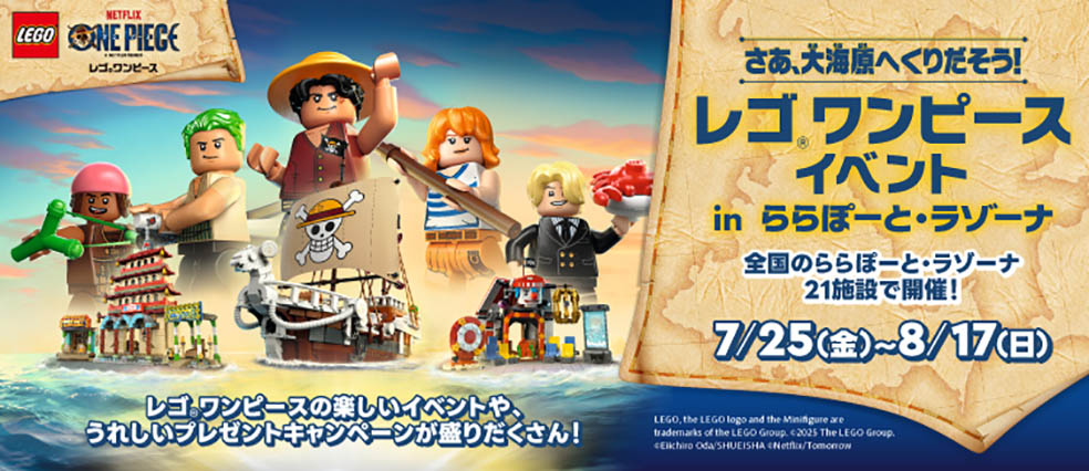 三井ショッピングパーク ららぽーと全国20施設とラゾーナ川崎プラザでは、夏休みにぴったりのスペシャルイベント「レゴ®ワンピースイベント in ららぽーと・ラゾーナ」を、2025年7月25日(金)〜8月17日(日)まで開催。