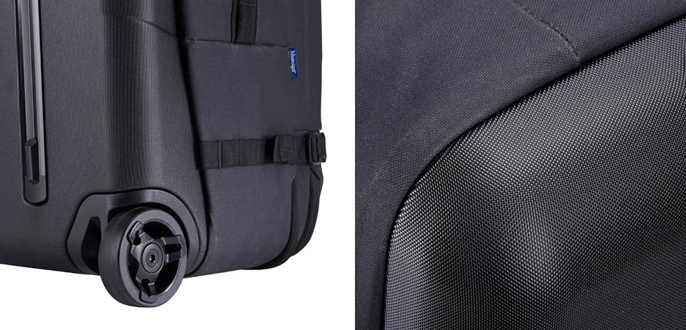 タフな特大ホイールとV字チューブ伸縮ハンドルは、どんな地形でも楽に滑走。100%リサイクル生地と50%リサイクルポリカーボネートパネル。