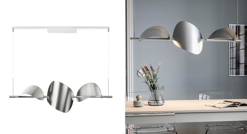 やわらかな曲線のパーツが重なり合い、まるで葉が宙に浮いて舞っているように見える印象的なペンダントランプ。